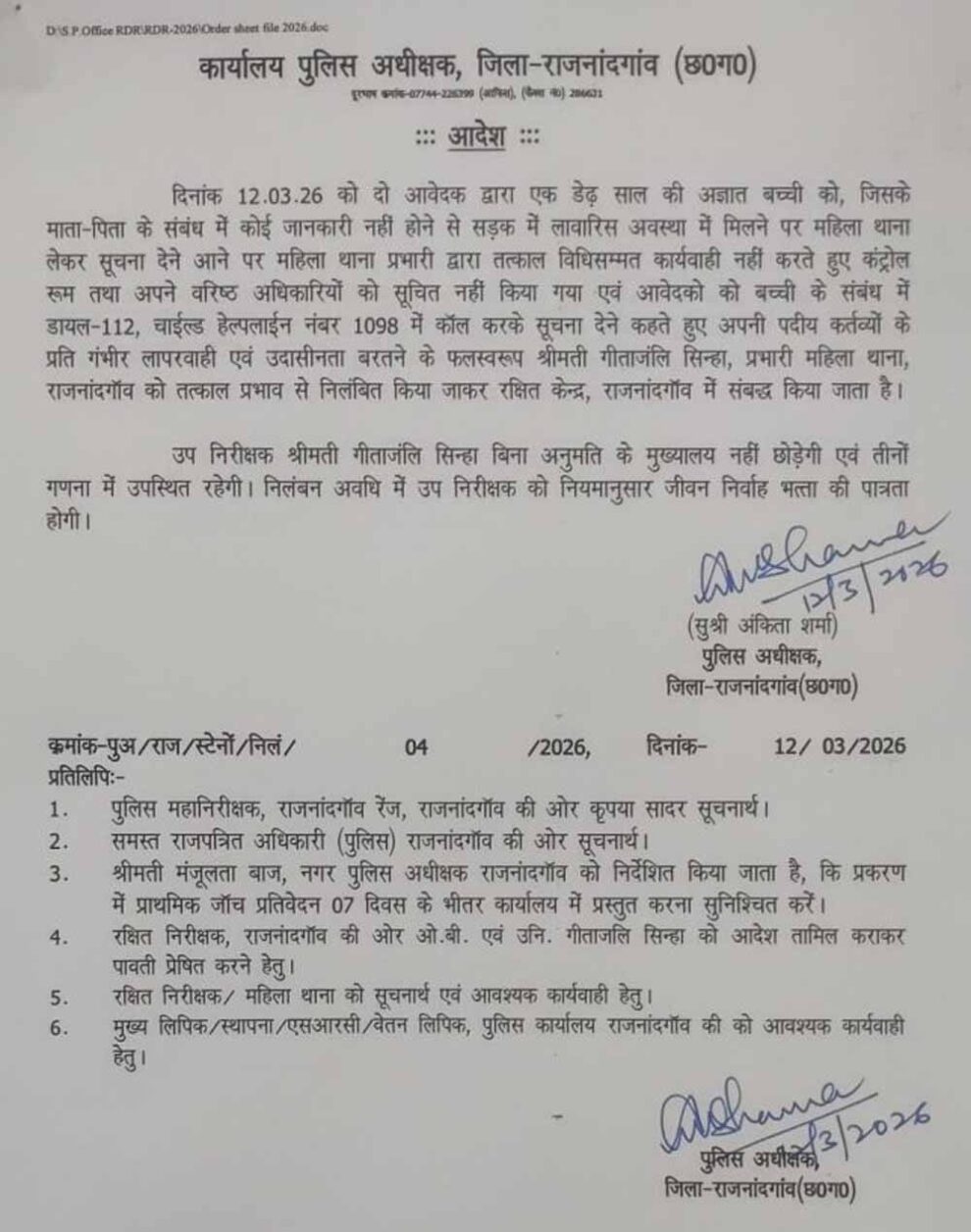 शहर के बाजार क्षेत्र में पिता से बिछड़ी डेढ़ वर्षीय मासूम बालिका के मामले में पुलिस की गंभीर लापरवाही सामने आने के बाद पुलिस अधीक्षक अंकिता शर्मा ने कड़ी कार्रवाई की है। मामले में त्वरित कार्रवाई न करने पर महिला थाना प्रभारी गीतांजलि सिंह और कोतवाली थाने के आरक्षक चंद्रेश सिन्हा को तत्काल प्रभाव से निलंबित कर लाइन अटैच कर दिया गया है। साथ ही कोतवाली थाना प्रभारी नंदकिशोर गौतम का भी तबादला कर दिया गया है।